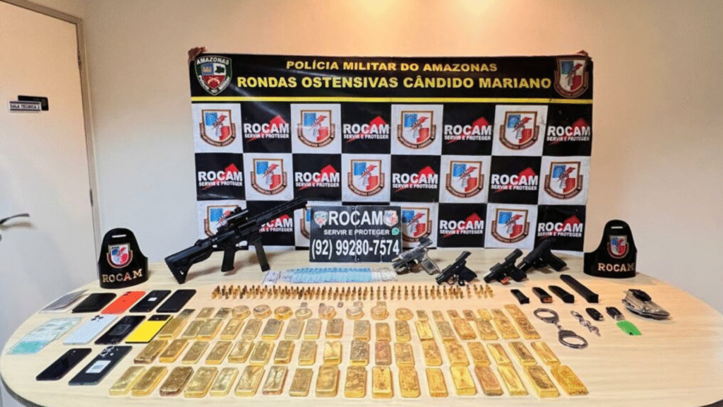A PMAM (Polícia Militar do Amazonas) apreendeu 77 barras de ouro avaliadas em R$ 45 milhões e prendeu seis homens em Manaus (AM), na noite desta quarta (29). O montante totalizou 72,5 quilos. Entre os presos estão dois policiais militares e um policial civil. De acordo com a PMAM, a equipe da…