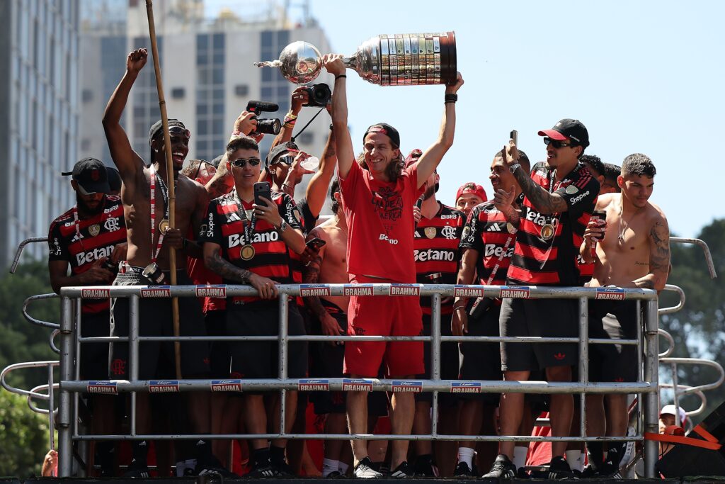 Após vencerem o Palmeiras por 1 a 0 em Lima no sábado (29), os jogadores do Flamengo festejaram o tetracampeonato da Copa Libertadores com a torcida no Rio de Janeiro, neste domingo (30), com desfile em carro aberto no centro da cidade. A celebração foi marcada por provocações direcionadas…