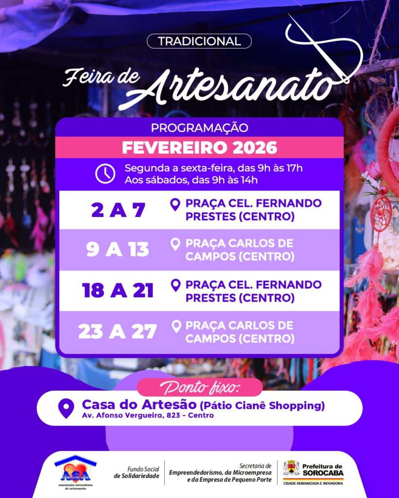 A Prefeitura de Sorocaba, por meio da Secretaria de Empreendedorismo, da Microempresa e da Empresa de Pequeno Porte (Semepp), em parceria com o Fundo Social de Solidariedade (FSS) e a Associação Sorocabana de Artesanato (ASA), divulga o calendário de fevereiro da tradicional Feira de Artesanato…