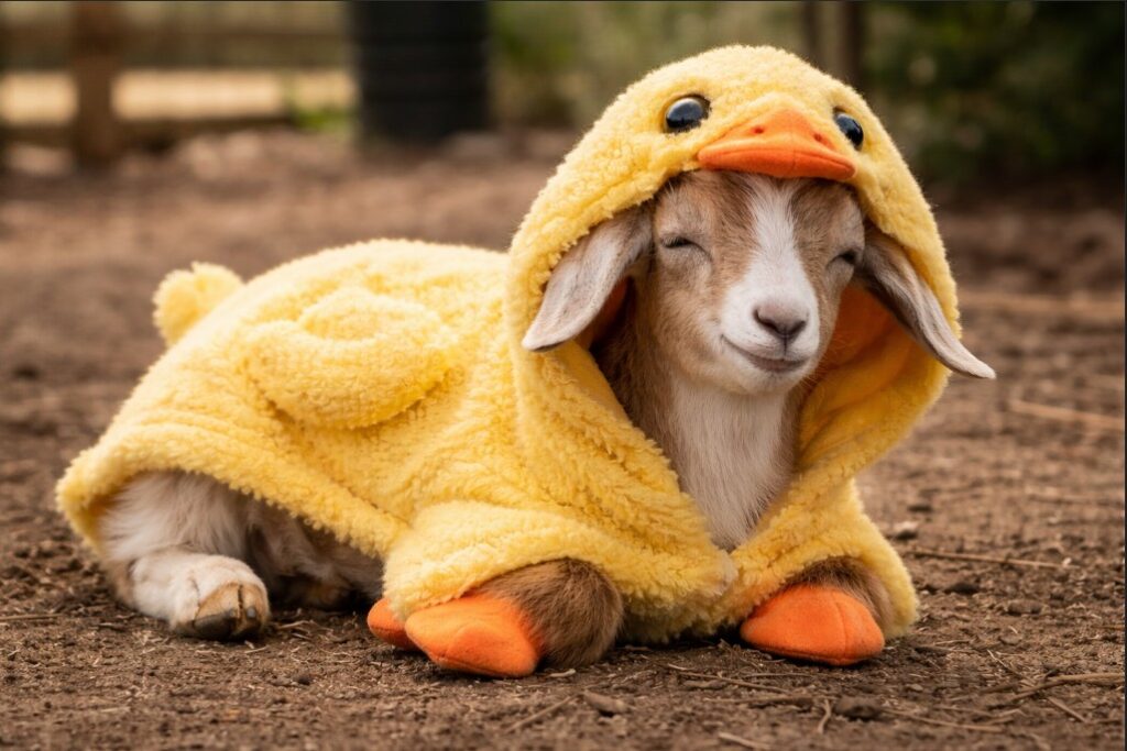 Essa cabra ansiosa é apaixonada por sua fantasia de patinho