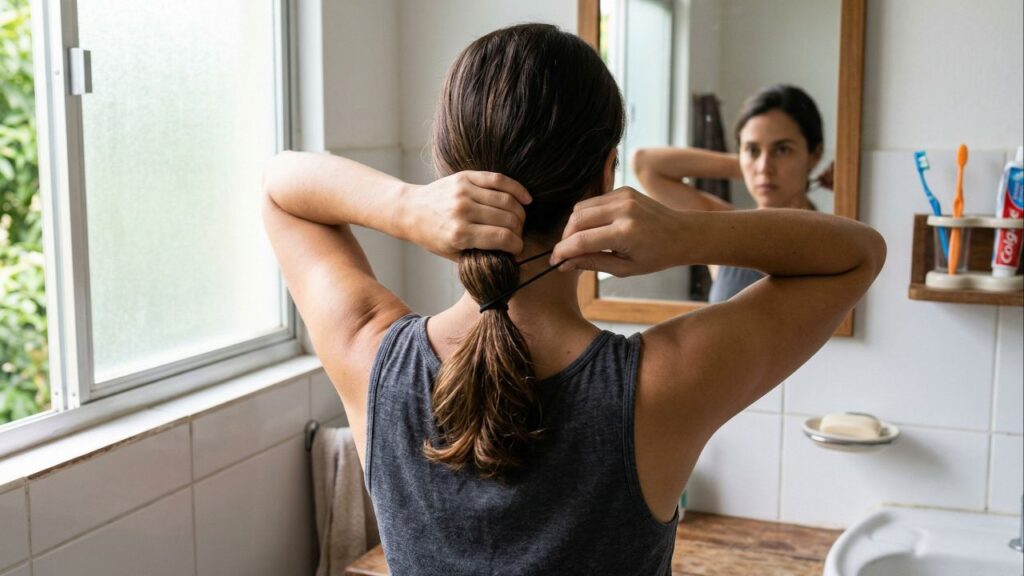 Prefira elásticos revestidos em tecido ou silicone macio, faça hidratações periódicas com máscaras ou condicionadores adequados ao seu tipo de fio e use proteção térmica antes de secador, chapinha ou babyliss. Reservar dias com penteados mais frouxos ou cabelo solto ajuda a manter o couro cabeludo saudável e o rabo de cavalo bonito por mais tempo.