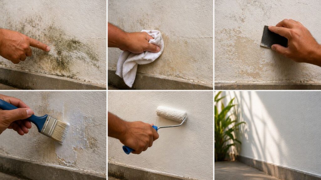 Em casos de umidade leve, quando ainda não há grandes bolhas ou reboco solto, é possível adotar um procedimento simples, desde que a fonte da água já tenha sido controlada. O objetivo é secar, preparar a superfície e criar uma barreira que ajude a evitar que a parede descasque novamente no mesmo ponto.