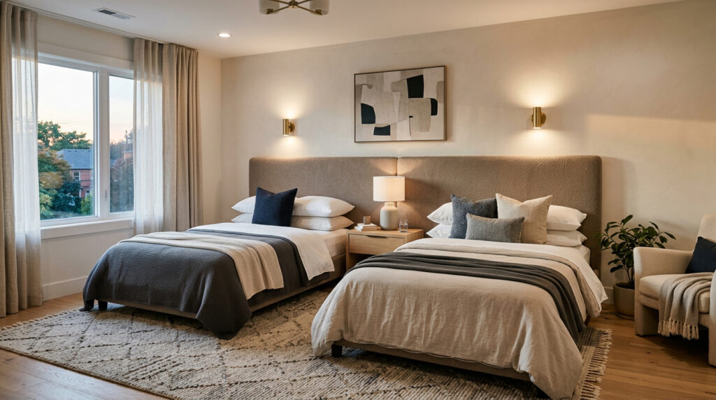 O segredo está em manter unidade visual. Uma cabeceira maior, tapete amplo, luminárias parecidas e cores conversando entre si fazem o quarto parecer planejado, não improvisado. Assim, cada lado ganha autonomia sem quebrar a harmonia do ambiente.