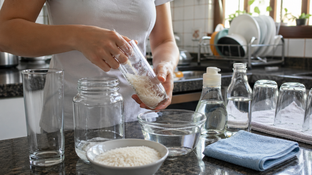 Copos altos, garrafas e jarras com gargalo estreito podem acumular resíduos onde a esponja não chega. Nesses casos, o truque do arroz ajuda a soltar marcas internas sem exigir escovas duras.