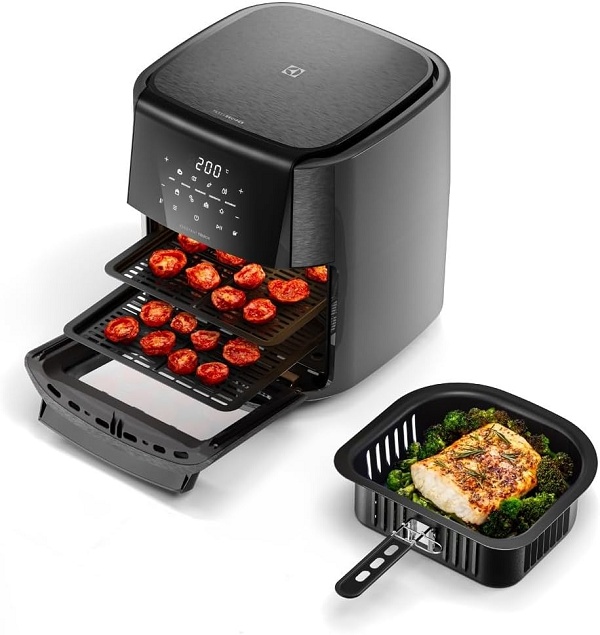 A faixa de temperatura vai de 60°C a 200°C, permitindo desde uma desidratação lenta até um gratinamento rápido. E os testes realizados com o aparelho mostraram redução de até 89% na gordura e quase 49% nas calorias em comparação com a fritura convencional em óleo.