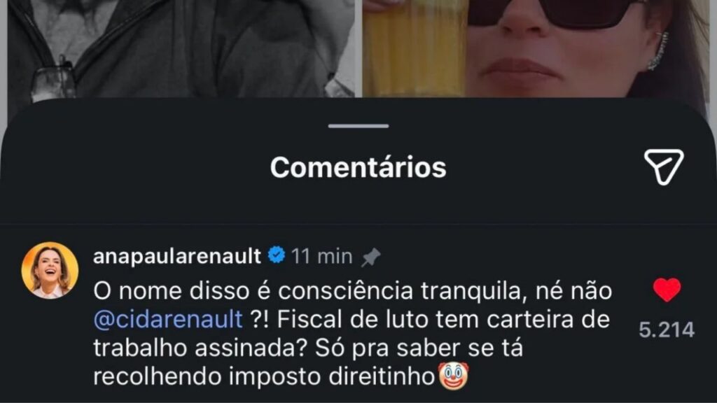 “O nome disso é consciência tranquila, né não @cidarenault?! Fiscal de luto tem carteira de trabalho assinada? Só pra saber se tá recolhendo imposto direitinho”, escreveu Ana Paula em um comentário no Instagram da irmã, com emoji de palhaço no final.