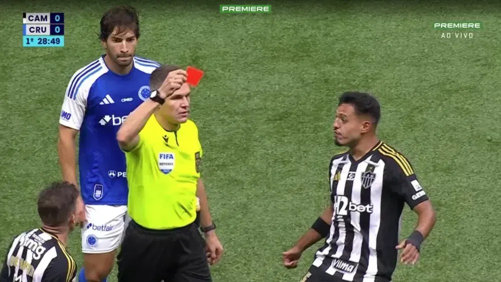 Já no segundo, dois minutos depois, o árbitro voltou a se confundir e levantou o vermelho para Kaio Jorge. Novamente, Zanovelli se corrigiu e aplicou o cartão amarelo para o atacante do Cruzeiro.