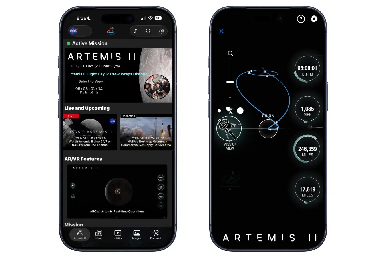 O app oficial da NASA, disponível para iOS e Android,  tem uma aba dedicada à Artemis II com transmissões ao vivo pelo NASA+, perfis da tripulação e acesso direto ao AROW. O diferencial está no modo de realidade aumentada: ao apontar a câmera do celular para qualquer direção, o aplicativo usa o giroscópio e a bússola do aparelho para sobrepor na tela a posição aproximada da Orion em relação ao ponto onde o usuário está, sem precisar estar ao ar livre. É uma forma concreta de ver que aquela nave, com quatro pessoas a bordo, está se aproximando agora.
