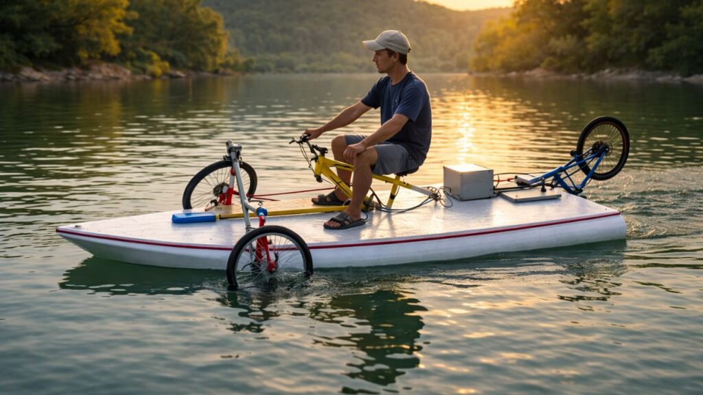 Um barco anfíbio construído a partir de sucata de bicicleta é uma invenção caseira que combina a estrutura de um veículo terrestre com casco ou flutuadores capazes de manter tudo acima da linha d’água. Em geral, o quadro das bicicletas funciona como esqueleto de sustentação, enquanto rodas, correntes e pedivelas são reaproveitados para criar sistemas de tração e direção.
