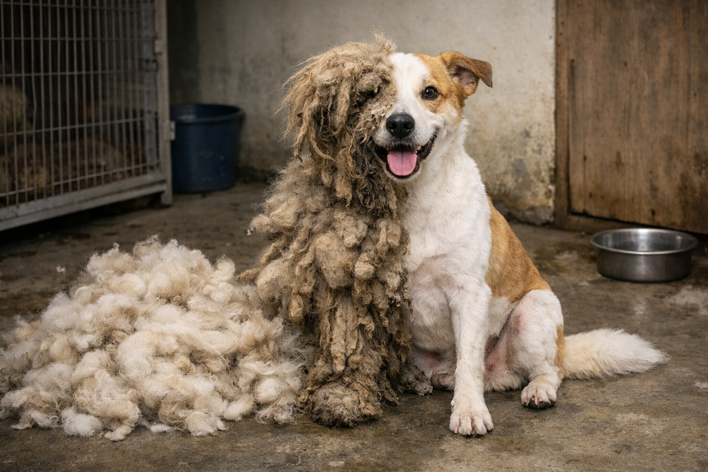 Animais com pelos emaranhados podem esconder sua verdadeira condição física. Durante o resgate, os socorristas perceberam que a pelagem acumulada era extremamente pesada.