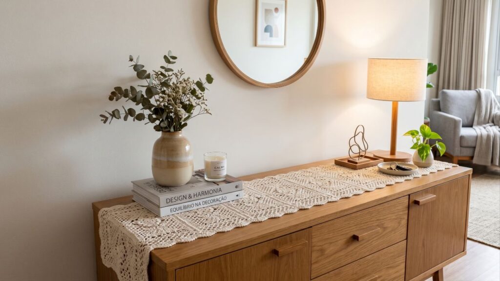 Para integrar o caminho de mesa de crochê ao ambiente, muitos decoradores sugerem repetir cores em outros elementos, como guardanapos, almofadas ou tapetes. Dessa forma, a peça não aparece isolada, mas como parte de um conjunto. Em cozinhas e áreas gourmets, é comum combinar o caminho com sousplats de crochê ou porta-copos feitos com o mesmo fio, criando uma composição contínua.
