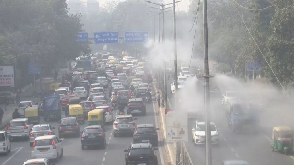 A capital da Índia, Nova Délhi, instalou borrifadores de água em postes em vias públicas para conter a poluição que atinge o país.