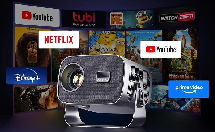 Disney+, Prime Video, Globoplay, Max e qualquer outro serviço disponível na Play Store pode ser instalado diretamente no projetor. Com 2GB de RAM e 16GB de armazenamento interno, o sistema roda os aplicativos de streaming sem travamentos nas funções essenciais de reprodução.