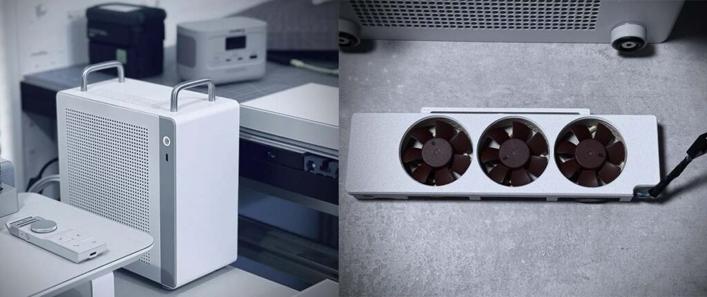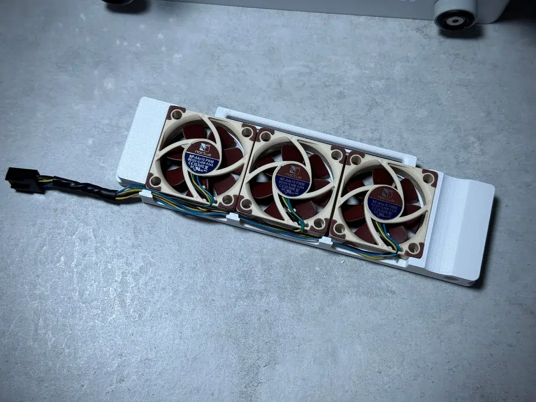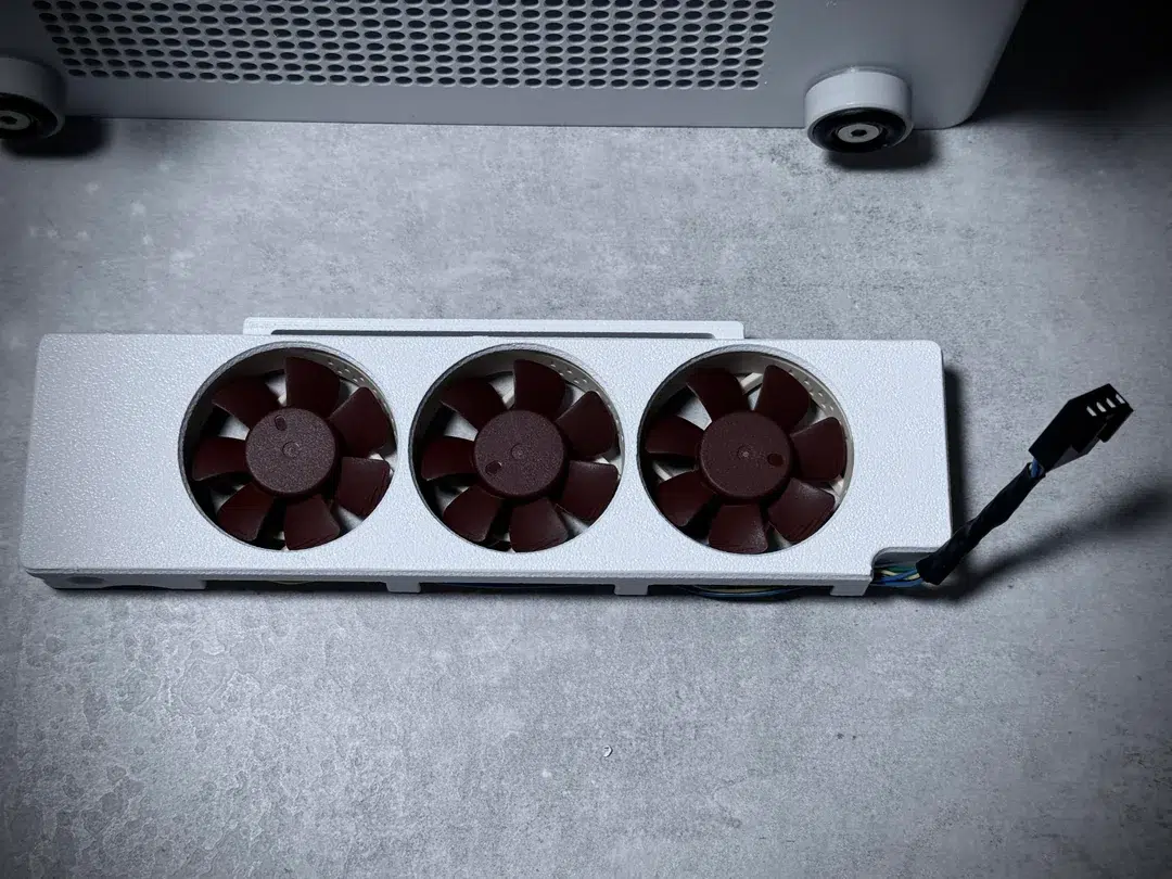 Foi aí que entrou em ação a impressora 3D. O usuário projetou e imprimiu um suporte personalizado para fixar três fans Noctua NF-A4x10 PWM, cada uma com 40 mm de diâmetro e 10 mm de espessura, as menores da linha da fabricante austríaca. O suporte posiciona as três unidades de forma coordenada para criar um fluxo de ar controlado dentro do gabinete, algo que os espaços e encaixes nativos do NV10 não permitem por padrão. Sem esse componente fabricado sob medida, a dissipação de calor de um sistema com esse nível de consumo seria inviável nesse volume.