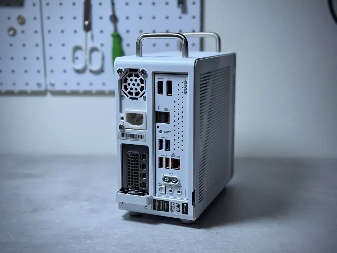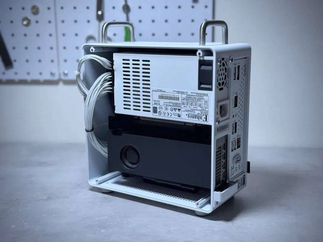 A GPU é o componente mais incomum da lista. A RTX Pro 4000 Blackwell SFF foi lançada em agosto de 2025 e é uma placa de perfil único (ocupa apenas um slot de expansão) com dimensões de 167 mm × 69 mm × 20 mm. Apesar do tamanho, ela conta com 8.960 unidades de processamento, 24 GB de GDDR7 com barramento de 192 bits, largura de banda de 432 GB/s e consumo máximo de apenas 70 W. O desempenho teórico em FP32 é de 23,96 TFLOPS, com capacidade de 766,69 TFLOPS em operações de IA com FP4.