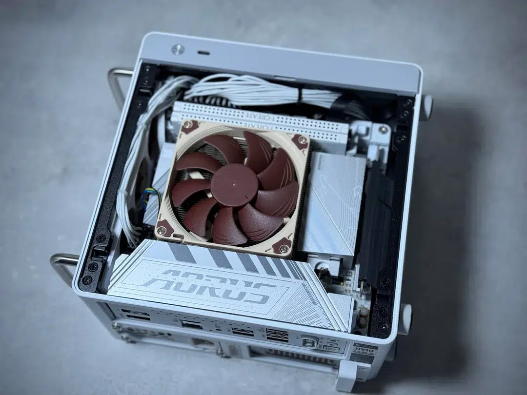 O gabinete JONSBO NV10 aceita coolers de CPU com altura máxima de 38 mm, o que elimina praticamente qualquer solução de refrigeração de alto desempenho do mercado convencional. A escolha foi o Noctua NH-L9I, um dos poucos coolers de baixo perfil com reputação consolidada, ele mede 37 mm de altura. Mas refrigerar apenas o processador não era suficiente: o fluxo de ar dentro de um gabinete tão compacto precisa ser ativo e bem direcionado.