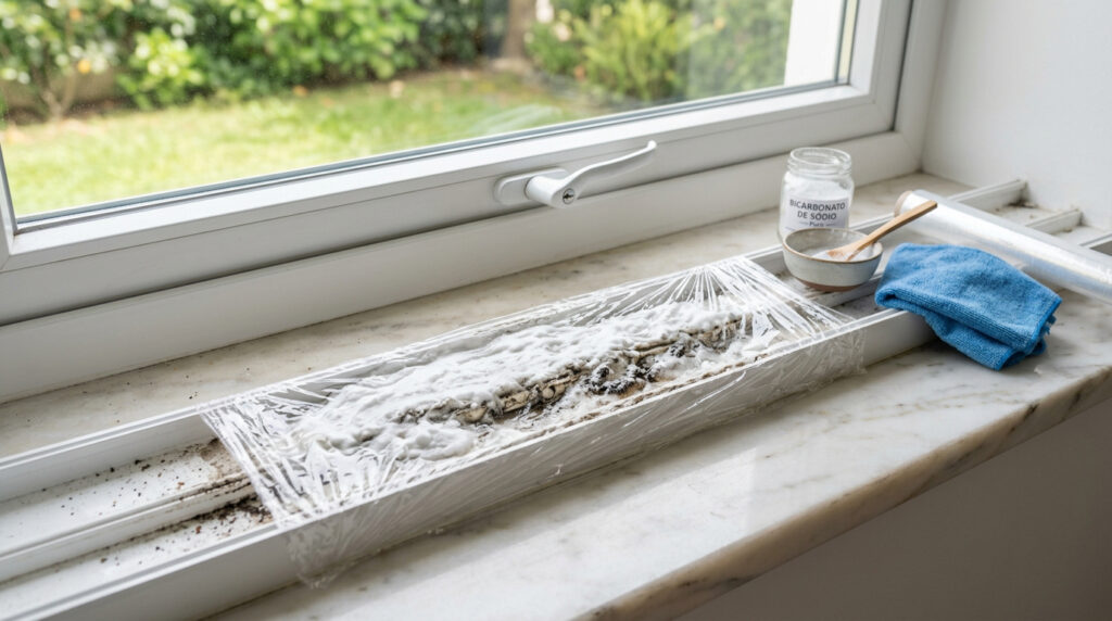 Colocar bicarbonato de sódio e filme plástico nos trilhos das janelas é um truque de limpeza usado para soltar poeira grudada, resíduos de umidade e sujeira acumulada em cantos estreitos. Os trilhos costumam juntar terra, pelos, insetos pequenos, mofo leve e gordura do ar, por isso a combinação ajuda a amolecer a sujeira antes da escovação.