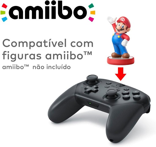 Para quem coleciona ou usa amiibos, ter a funcionalidade embutida no controle é extremamente prático. Basta aproximar a figure do controle para ativar conteúdos extras, desbloquear itens especiais ou trazer personagens para dentro do jogo.