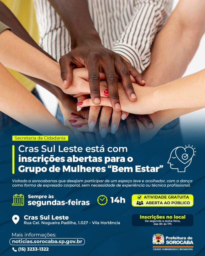 A Prefeitura de Sorocaba, por meio da Secretaria da Cidadania (Secid), está recebendo as inscrições para o Grupo de Mulheres “Bem Estar” no Centro de Referência em Assistência Social (Cras) Sul Leste. Os encontros gratuitos ocorrem sempre às segundas-feiras, às 14h.