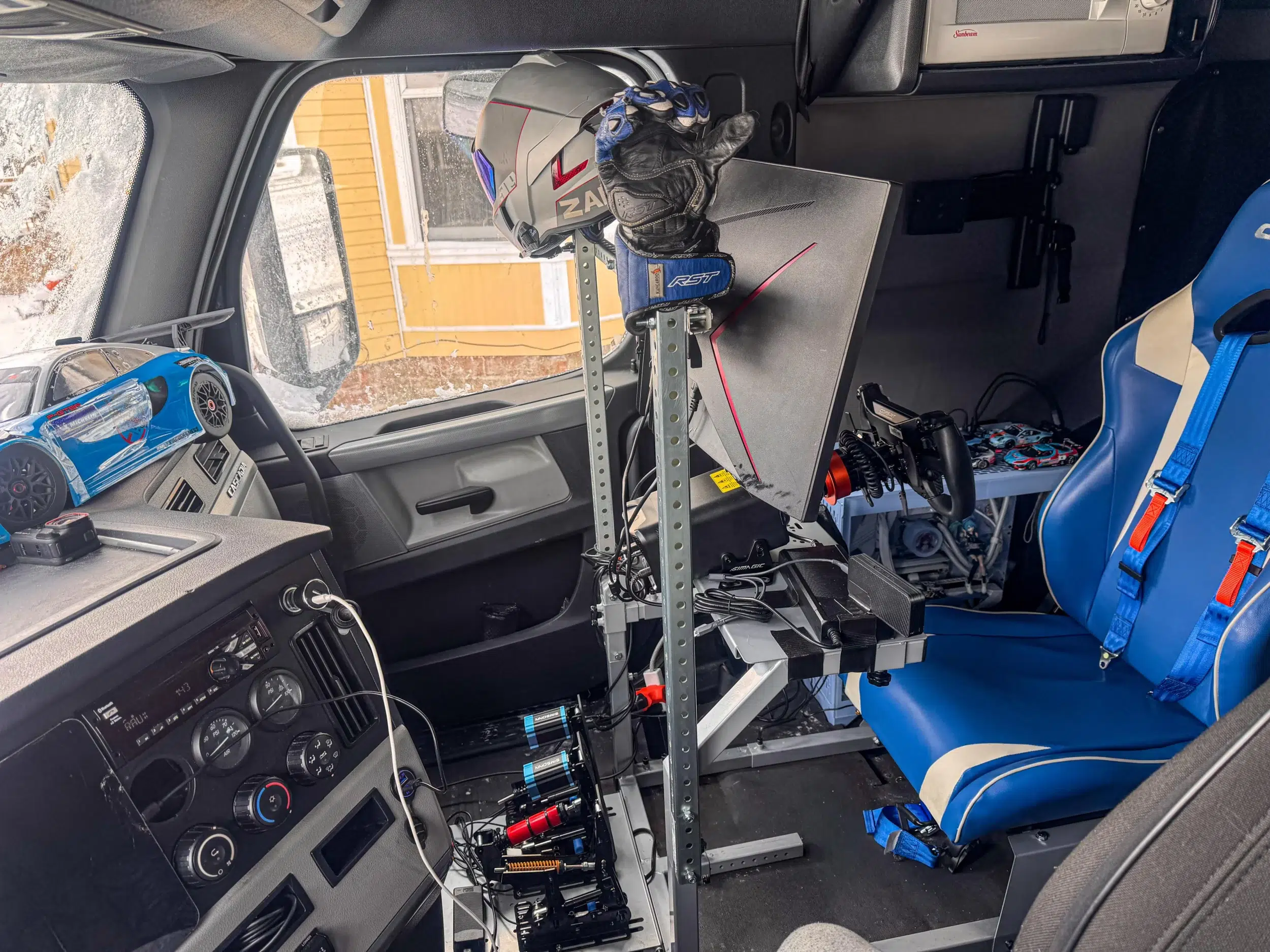 Um caminhoneiro americano identificado no Reddit como ZanaZamora substituiu o banco do passageiro de seu caminhão por um cockpit de simulação completo. A lista de gadgets inclui um desktop, volante em fibra de carbono, freio por célula de carga, monitor ultrawide, headset de realidade virtual e equipamento de simulação de voo. Tudo fixado por correias, dois pontos de ancoragem e um parafuso reaproveitado do banco original, com custo total de US$ 6.000.