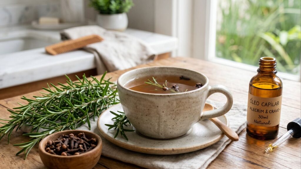 alecrim contém compostos como vitamina C, ácido rosmarínico e polifenóis, que ajudam a combater os radicais livres e o envelhecimento precoce das células do couro cabeludo. Já o cravo da índia é rico em eugenol, que possui ação antifúngica e antibacteriana, contribuindo para controlar caspa leve, coceira e irritações suaves.