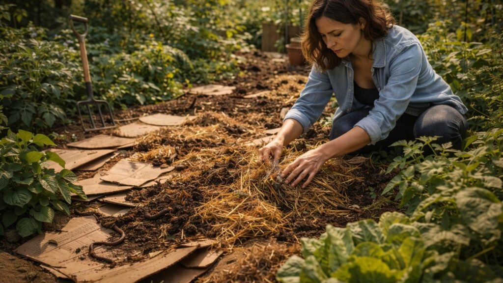 Com o passar dos meses, o papelão se desfaz, as raízes atravessam as camadas e o conjunto se integra ao solo original. O canteiro pode receber novas camadas de material orgânico periodicamente, sem necessidade de revolver toda a área, o que torna o manejo mais leve a cada temporada.