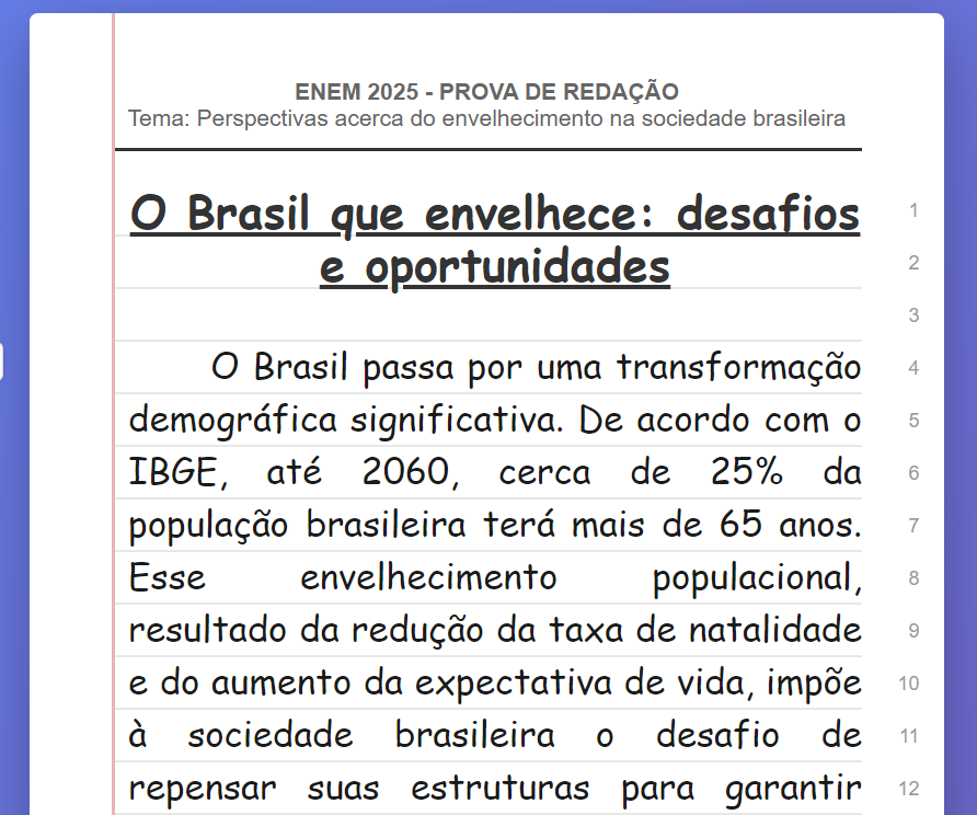 “Você é um candidato que está prestando Enem 2025. Escreva a redação a partir do tema ‘Perspectivas acerca do envelhecimento na sociedade brasileira’. Você está escrevendo à mão.