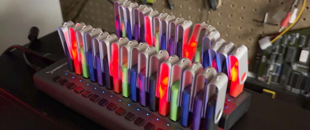 Um engenheiro da AWS montou um servidor de armazenamento compatível com Amazon S3 usando 32 pendrives USB comprados como os mais baratos disponíveis, todos rodando em RAID 0 sobre um servidor HP ProLiant antigo. Nas imagens, os 32 pendrives aparecem enfileirados e iluminados, enquanto os terminais mostram cada unidade reconhecida pelo sistema como disco independente, todas com 3,8 GB cada.