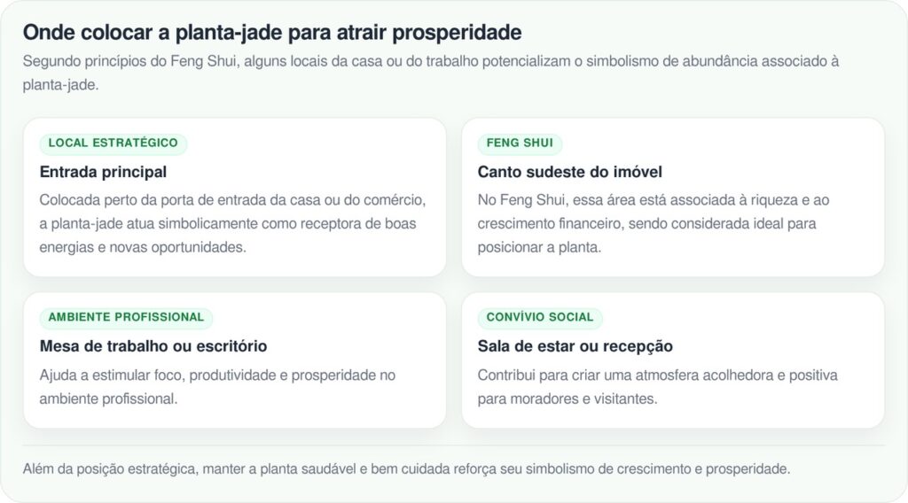 A escolha do local ideal para a planta-jade influencia tanto a saúde da suculenta quanto o efeito simbólico desejado por quem a cultiva. Práticas de harmonização energética, como o Feng Shui, indicam pontos específicos da casa ou do escritório que favorecem a atração de prosperidade. Os posicionamentos mais recomendados para a Crassula ovata incluem: