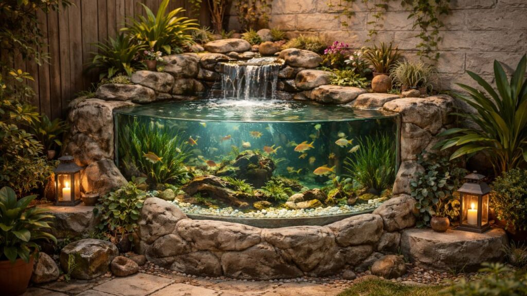Transformar um canto antigo do pátio em aquário de cimento é uma forma de renovar a área externa com reaproveitamento inteligente de espaço. Em vez de manter um local esquecido ou cheio de entulho, esse tipo de projeto cria um ponto de destaque permanente, unindo artesanato em cimento, design de aquário e decoração externa durável e personalizada.
