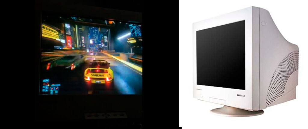 Um usuário do Reddit mostrou que ele rodou Cyberpunk 2077 em um monitor CRT, o Samsung Syncmaster 1200NF, um dos melhores monitores lançados em 2001.  O vídeo postado por ele mostra o personagem dirigindo pelas ruas de Night City a 85 quadros por segundo, na resolução 1280×960 pixels, com a tremulação fosforescente típica dos tubos catódicos. A estética não é acidental: é exatamente esse “ruído analógico” que motivou o experimento. “As cores do vídeo não foram editadas, apenas o Reshade do jogo foi usado para adicionar um leve ruído VHS e borrões de croma para dar aquele toque extra de CRT”, afirmou na postagem.