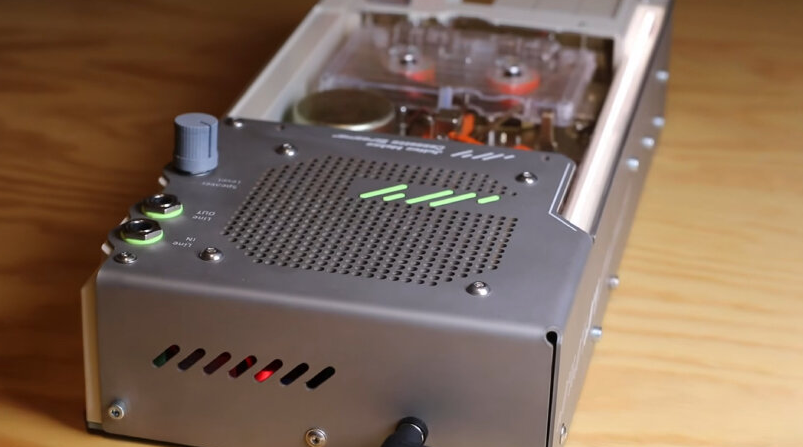 Para a reprodução, Curt usou um chip originalmente fabricado para rádios de carro, que faz exatamente o que a máquina precisa: amplifica o sinal da cabeça de leitura e corrige os desequilíbrios tonais que a gravação em fita introduz naturalmente. Esse sinal vai para um amplificador e depois ao alto-falante. A carcaça externa combina aço inox dobrado nas laterais com o corpo metálico original do deck, e um painel de acrílico transparente cobre a seção do loop, permitindo ver a fita em movimento.