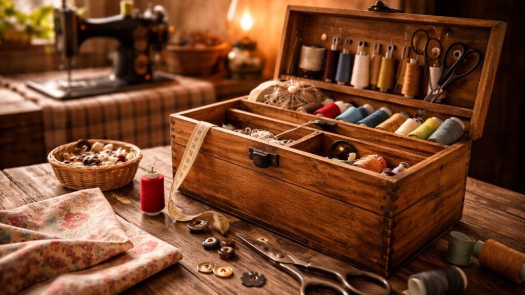 No passado, certos objetos simples acompanhavam o cotidiano das famílias. A caixa de costura ficava sempre por perto, pronta para pequenos reparos e tarefas domésticas.