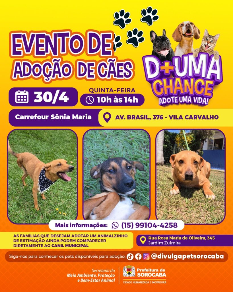 A Prefeitura de Sorocaba, por meio da Secretaria do Meio Ambiente, Proteção e Bem-Estar Animal (Sema), realizará, nesta quinta-feira (30), das 10h às 14h, e evento de adoção de cães do Canil Municipal no Carrefour Sônia Maria, localizado na Avenida Brasil, 376, na Vila Carvalho.