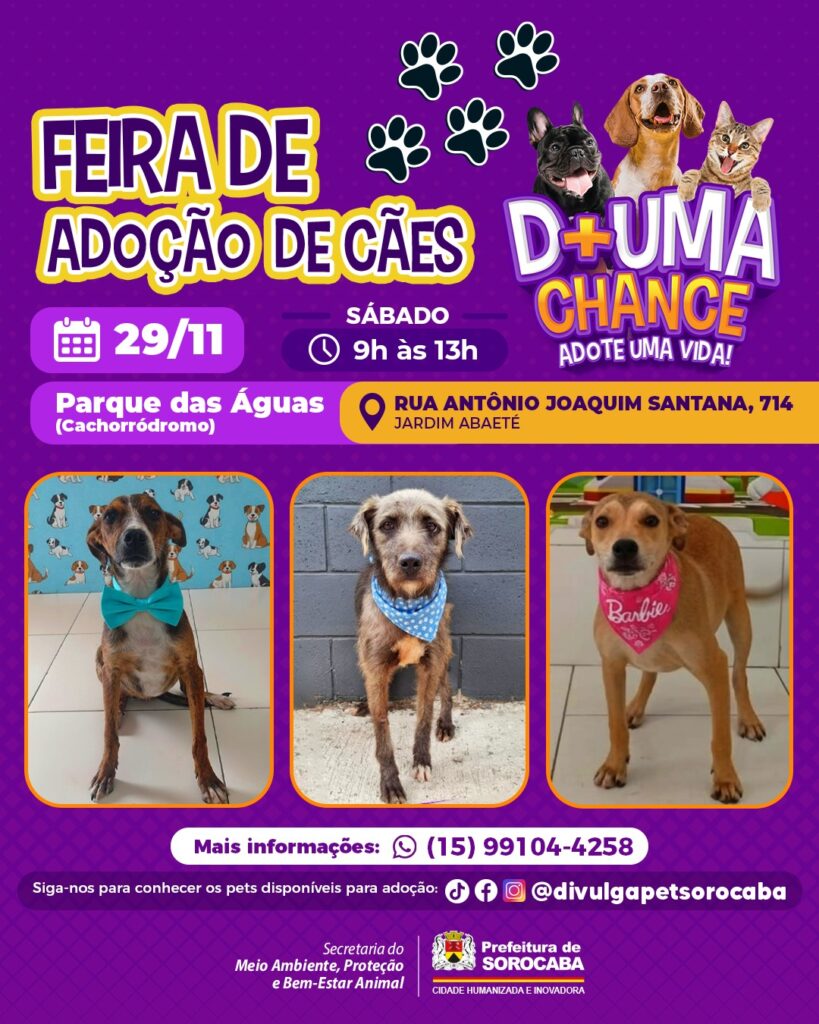A Prefeitura de Sorocaba, por meio da Secretaria do Meio Ambiente, Proteção e Bem-Estar Animal (Sema), realiza, neste sábado (29), das 9h às 13h, a feirinha de adoção de cães no Cachorródromo do Parque das Águas, no Jardim Abaeté.