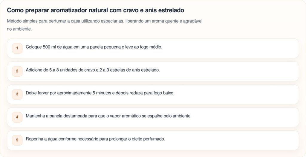 Não existe uma regra fixa, mas a maioria das pessoas que adota essa prática costuma ferver anis estrelado e cravo de duas a três vezes por semana. Essa frequência é suficiente para manter a casa sempre perfumada sem desperdiçar especiarias. Nos dias de faxina geral ou antes de receber visitas, o ideal é preparar a mistura com antecedência para que o aroma já esteja espalhado.