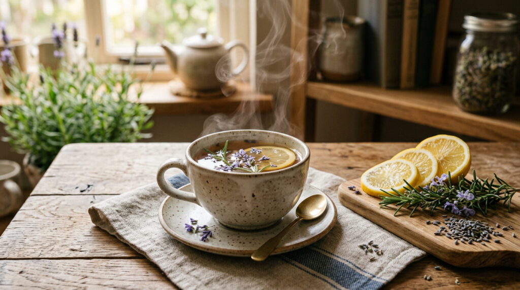 O segredo está na quantidade. Lavanda e alecrim são ingredientes potentes, e o limão pode amargar quando a parte branca da casca é fervida por muito tempo. Por isso, a fervura deve ser curta, apenas o suficiente para liberar aroma e cor suave na água.