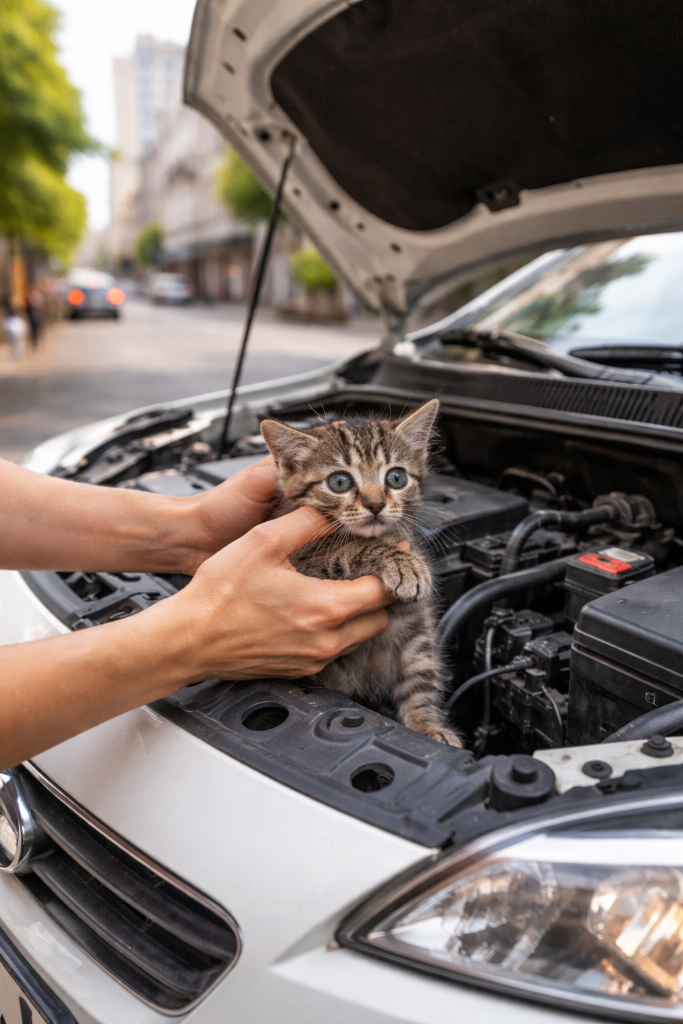 O pequeno gato provavelmente se escondeu no motor ou em alguma estrutura interna do carro, algo comum entre animais em situação de risco. No universo dos pets, esse comportamento demonstra instinto de sobrevivência e adaptação.