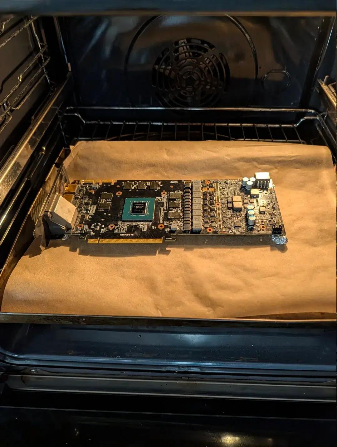 Antes de apelar para o fogão, o jogador tentou o manual do bom técnico: reinstalou drivers, aplicou pasta térmica premium, trocou thermal pads e limpou tudo com álcool isopropílico. Nada funcionou. Sem opções, ele removeu o dissipador, protegeu a placa com papel alumínio e a submeteu ao calor extremo. A técnica é uma versão rudimentar do reflow. O objetivo é fazer com que a solda de estanho nos chips BGA (como a GPU e as memórias GDDR5X) atinja o ponto de fusão, fechando microfissuras causadas por anos de ciclos térmicos. E, para surpresa de muitos, funcionou: a placa voltou a dar imagem estável e rodar jogos.