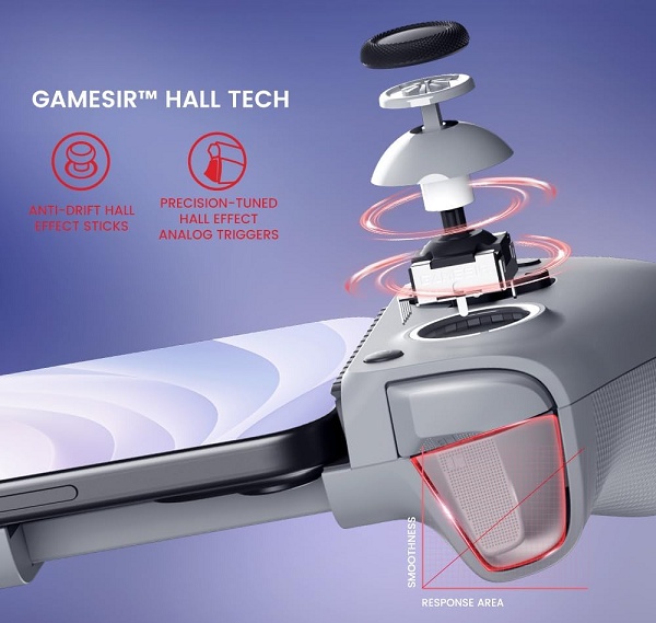 Além disso, ele também permite adaptar tudo ao seu estilo. Isso porque o G8 vem com capas de joystick removíveis em três alturas e texturas variadas, para se adequar a qualquer gênero de jogo. Dois botões extras nas costas permitem remapear ações na hora, salvando perfis personalizados que sincronizam instantaneamente. Pelo app GameSir (exclusivo para Android), você ajusta tudo: desde zonas de sensibilidade até o layout do D-pad. É como ter um ateliê de controles no bolso, tornando cada partida única e otimizada para você.