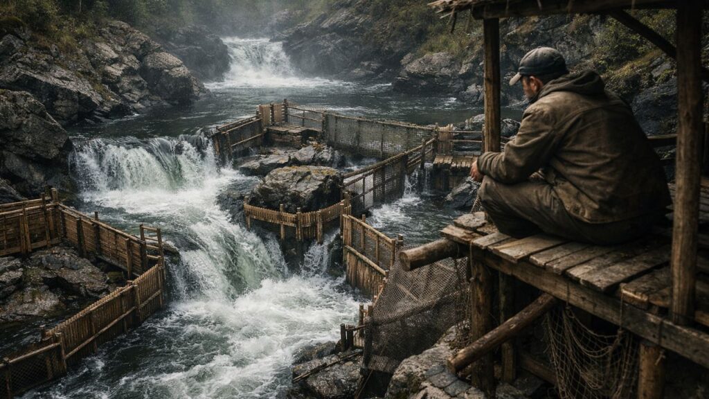 Em rios estreitos e corredeiras fortes, um homem transforma a própria correnteza em parte de um sistema de pesca impressionante. Usando observação e criatividade, ele cria armadilhas que parecem verdadeiras soluções de engenharia natural.