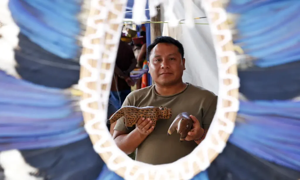 “Somos o primeiro povo que teve contato com os portugueses. E somos desmatados desde 1500”. Ele recorda que, na infância, via muito mais araras do que hoje, por exemplo. Tapurumã diz que a comunidade conta com projetos ambientais para reinserir as aves no ecossistema.
