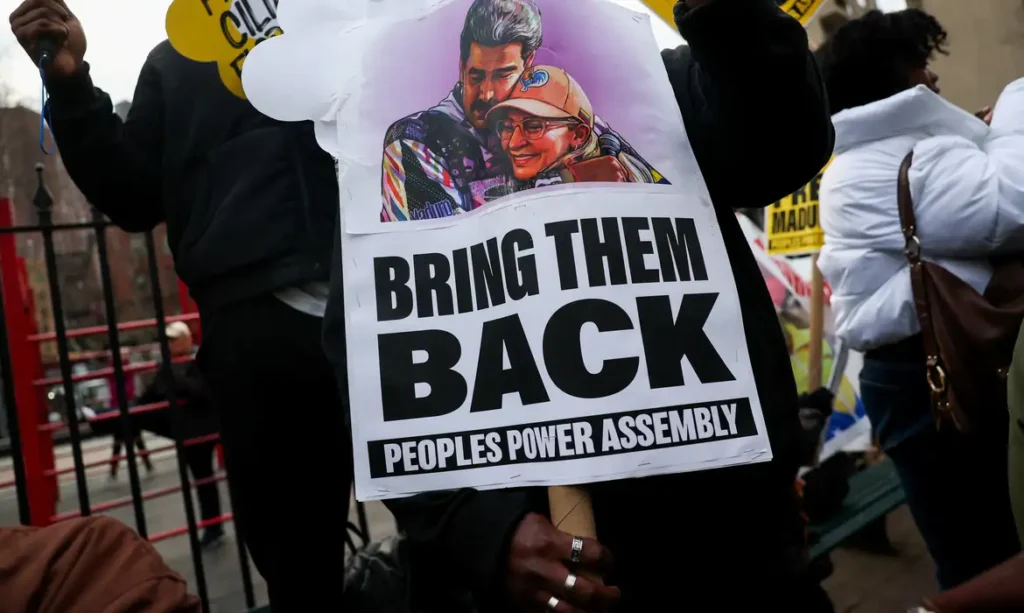 Ele e a esposa seguem presos em Nova York, quando foram presos durante uma operação das forças militares dos EUA na Venezuela em janeiro. Do lado de fora, manifestantes pediam a libertação de Maduro.