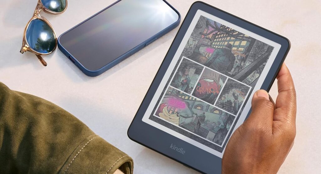 A grande novidade é a tela Colorsoft de 7″, que traz cores com uma característica importante: elas são suaves aos olhos, com visual próximo ao do papel. Não é uma tela LCD ou OLED vibrante como a do celular — é uma tela de tinta eletrônica colorida, pensada para leitura prolongada sem causar cansaço visual.