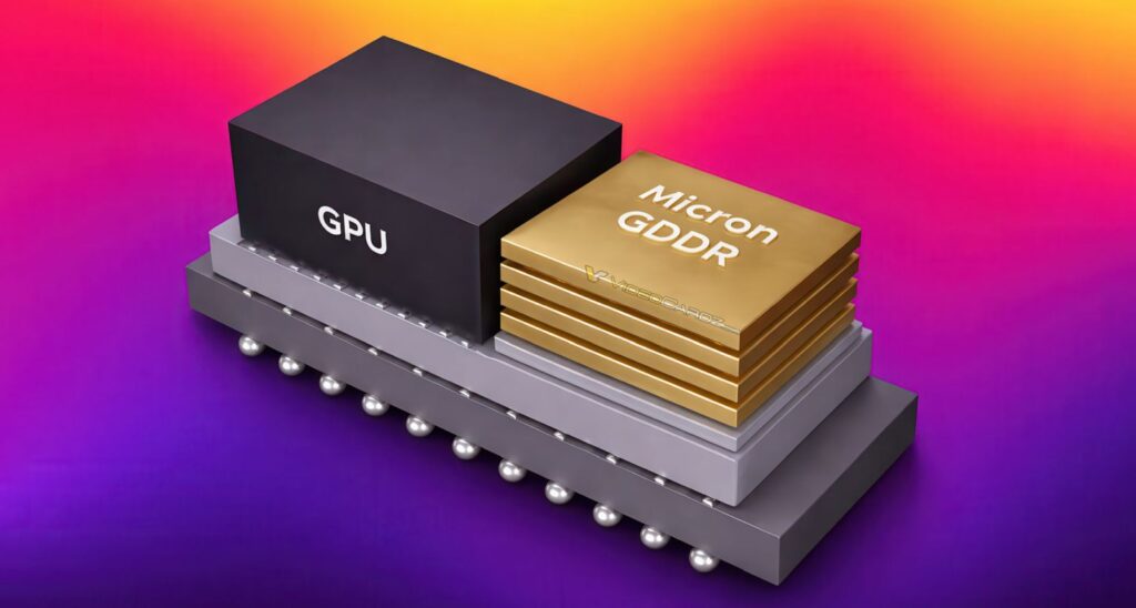 A Micron está trabalhando em um novo tipo de memória gráfica que empilha camadas verticalmente, o mesmo princípio construtivo da HBM, mas mantém a interface elétrica da família GDDR. Segundo o ETNews, a empresa inicia testes de fabricação no segundo semestre de 2026, com amostras funcionais previstas para 2027. As primeiras versões devem ter até quatro camadas.