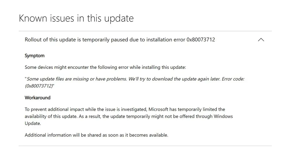 O problema central gira em torno do erro 0x80073712. Usuários que tentaram aplicar a KB5079391 foram recebidos com a mensagem: “Alguns arquivos de atualização estão ausentes ou com problemas. Tentaremos baixar a atualização novamente mais tarde”. Na prática, o sistema entrava em um ciclo infinito de tentativas falhas, consumindo processamento e largura de banda sem sucesso.