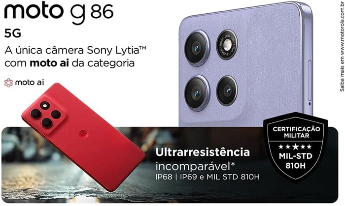 Moto g86 5G com 36% de desconto oferece 256GB, 24GB de RAM, câmera Sony, tela pOLED 1.5K e resistência militar