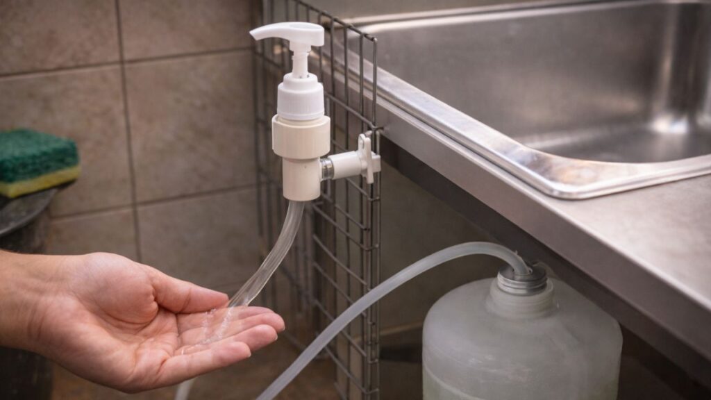 Depois da montagem, o dosador remoto precisa de um ponto fixo para uso diário, em posição vertical e estável. Em muitos casos, o cano com o pump é preso à lateral da pia, a uma grade metálica ou diretamente à bancada, formando uma espécie de torneira de produto de limpeza e liberando espaço visual.