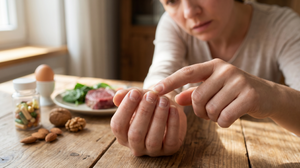 Entre os nutrientes mais lembrados nesse cenário, a biotina costuma aparecer primeiro, porque ela participa de processos ligados à formação da queratina. Mas ela não está sozinha. Ferro, zinco e proteína também entram no radar quando as unhas ficam finas, frágeis ou com crescimento mais lento.