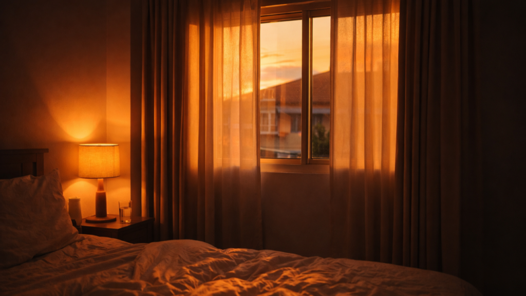 Em muitos casos, o problema não está apenas no ar da noite, mas no calor que ficou retido ao longo do dia. Quando a janela recebe sol direto por horas, cortinas leves ou transparentes quase não seguram esse impacto, e o ambiente vai armazenando temperatura nas paredes, no vidro e até nos móveis. Por isso, mesmo quando anoitece, o quarto segue abafado.
